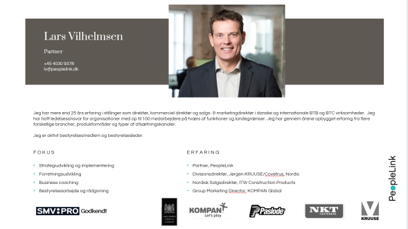 Har mere end 25 års erfaring i stillinger som direktør, kommerciel direktør og salgs- & marketingdirektør i danske og internationale BTB og BTC virksomheder. Han har haft ledelsesansvar for organisationer med op til 100 medarbejdere på tværs af funktioner og landegrænser. Jeg har gennem årene opbygget erfaring fra flere forskellige brancher, produktområder og typer af afsætningskanaler.